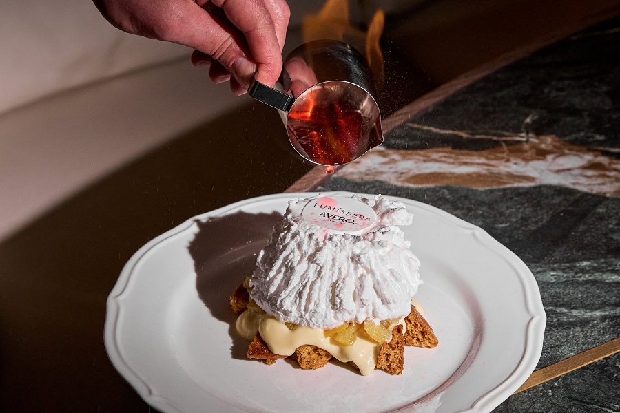 В атмосфере сияния свечей, где музыка проникает в самое сердце, рождается десерт. Специально для коллаборации шеф ресторана Avero mio Родион Садовский разработал десерт «Золотой век Голливуда», в основе которого – медовый бисквит с лимонным курдом, цукатами и итальянской заварной меренгой. При подаче десерт дополняют горящим апельсиново-персиковым джином.