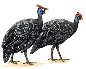 Цесарки - близкие родственники домашних кур, индеек и перепелок. Родина цесарок - Африка, но они прекрасно чувствуют себя в различных районах России при содержании как в закрытых помещениях, так и на выгулах и даже в клетках. Они болеют гораздо реже кур и другой птицы. Жизнь ведут стадную, хорошо уживаются с обитателями двора. Быстро бегают и могут даже взлетать, поэтому у взрослых особей на 5-6 см подрезают маховые перья на одном из крыльев.