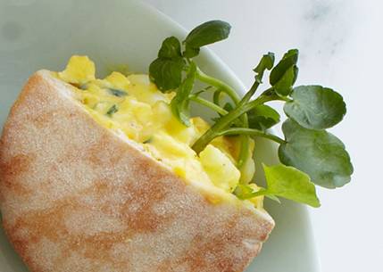 В большой миске смешайте майонез, лук шалот, зеленый лук, яблочный уксус, горчицу, карри и тмин. Затем добавьте яйца и яблоки, посолите и поперчите, тщательно перемешайте. Заполните половину булочек примерно 1 ст.л. смеси из яиц и украсьте салатом. Приятного аппетита!