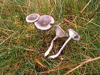 Ножка: очень тонкая, высотой 1-3 см, сначала сплошная, с возрастом полая, часто волнистая или изогнутая, у основания слегка утолщенная, покрыта шершавыми волоконцами. Пластинки довольно тонкие, редкие, не срастающиеся с ножкой и слабо нисходящие.