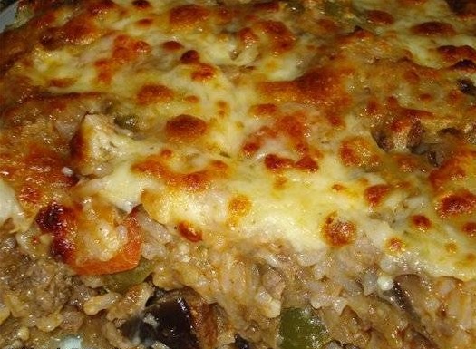 Приготовить рис: промыть его в холодной воде, вскипятить воду (в 2 раза больше объема риса), положить в нее рис, поджаренный на жиру лук, томатную пасту, посолить, вымешать. Варить на слабом огне. Когда рис впитает всю жидкость, перемешать его и запечь в духовом шкафу.