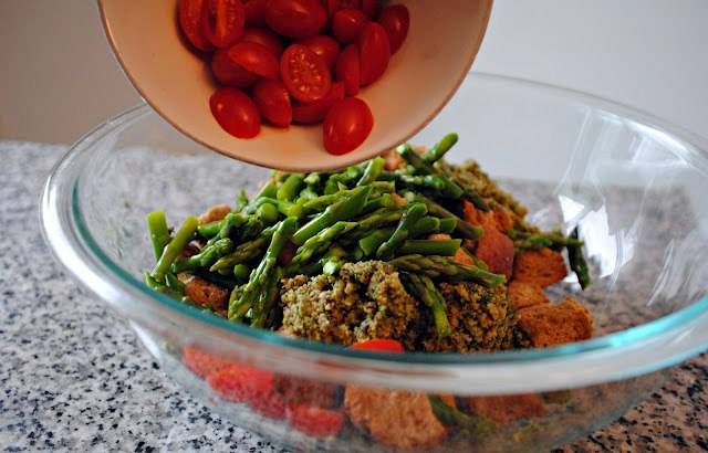 Добавьте 6 столовых ложек оливкового масла и перемешайте снова. Слейте спаржу и выложите в миску для салата.