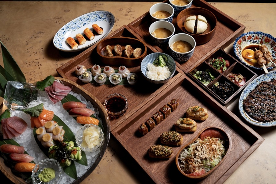Из горячих закусок гостям подготовили: тартар из говядины с маринованными шиитаке и хрустящим панисом, краб Уни с хрустящим панисом и салат с хрустящей уткой кацу. Димсамы и гедза — еще один знаковый раздел меню, который шеф-повар включил в сет. Димсамы готовят с цыпленком и трюфелем, а также краб, креветка и маринованная икура, гедза — с креветкой и соусом из черных соевых бобов.