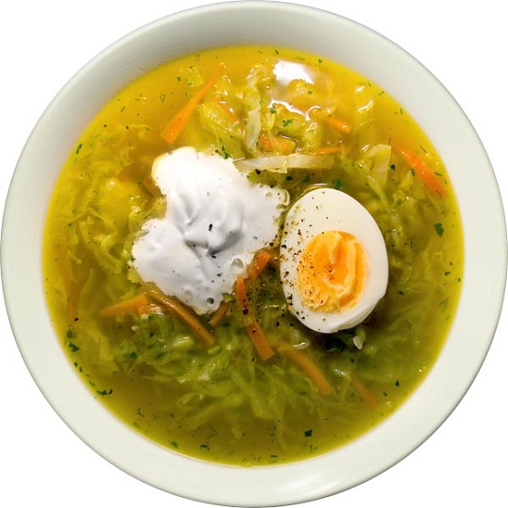 6. За 15 мин до подачи запассеровать на масле 1/2 ложки муки, развести бульоном, процедить в щи, прокипятить, снять сверху жир и опустить немного рубленой зеленой петрушки и перца.
