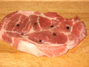 Мясо тщательно смазать растительным маслом. Я бы даже сказал втирать растительное масло в свинину. Посолить, поперчить каждый кусочек. Вдавить с каждой стороны по несколько горошин перца. Выложить подготовленные куски в кастрюлю со слоем лука и пряных трав. Сверху на мясо опять выложить слой лука с травами.