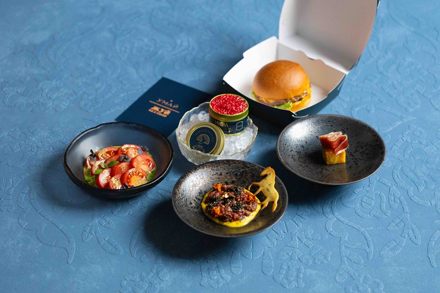 Сет объединил пять блюд. Для старта – картофельный многослойник с вяленым гусем и соусом со свежим хреном. Далее – свежие томаты с сырным муссом, шпинатом, зеленью и соусом из ароматных трав. Затем подадут тартар из конины с заправкой из трюфеля и трав, чёрной икрой и медовым чипсом, а после него – «Жуй-бургер». Завершает сет сливочный десерт «Икра» с щавелем и икрой из малины.