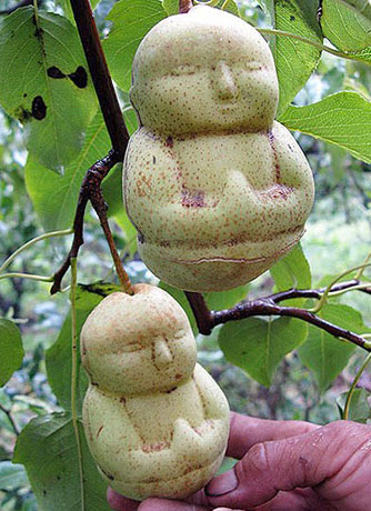 Хоть идея и не новая, американский фермер John M. Czeski выращивал тыквы с человеческим лицом помещая их в алюминиевые пресс-формы еще в 30-ых годах, тем не менее груши впечатляют!